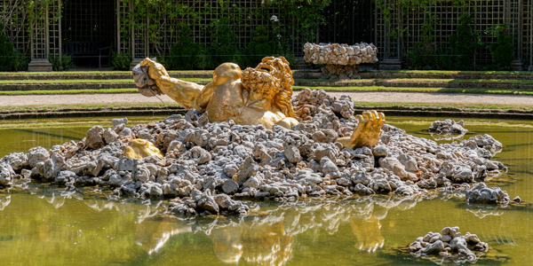 Enceladus fountain in the Gardens of Chateau de VersaillesLa Fontaines des Versailles (“The Fountains of Versailles”) is taken from this collection of Simphonies. Written to celebrate the architectural wonder that was the fountains and waterworks in the gardens of the Palace of Versailles, this suite evokes magnificence right from its opening Overture. The Air de Ancelade depicts one of the most dramatic fountains in the Palace – that of the titan Ancelade half-buried beneath a pile of rocks, struggling against his punishment for attempting to overthrow the Olympian gods (like Jupiter and Apollo). The powerful jet of water that springs from Ancelade’s mouth represents his final, struggling cry, and with this fountain Louis XIV put out a warning to any rebellious nobility that might dare to challenge the Sun King’s authority. The dramatic Air is followed by the vocal number Plaintes, regrets (Laments, regrets), performed today with plaintive oboes taking the role of the singers. Although melancholic in feeling, the text of the movement speaks of the desire for harmony and utopia within the Palace: